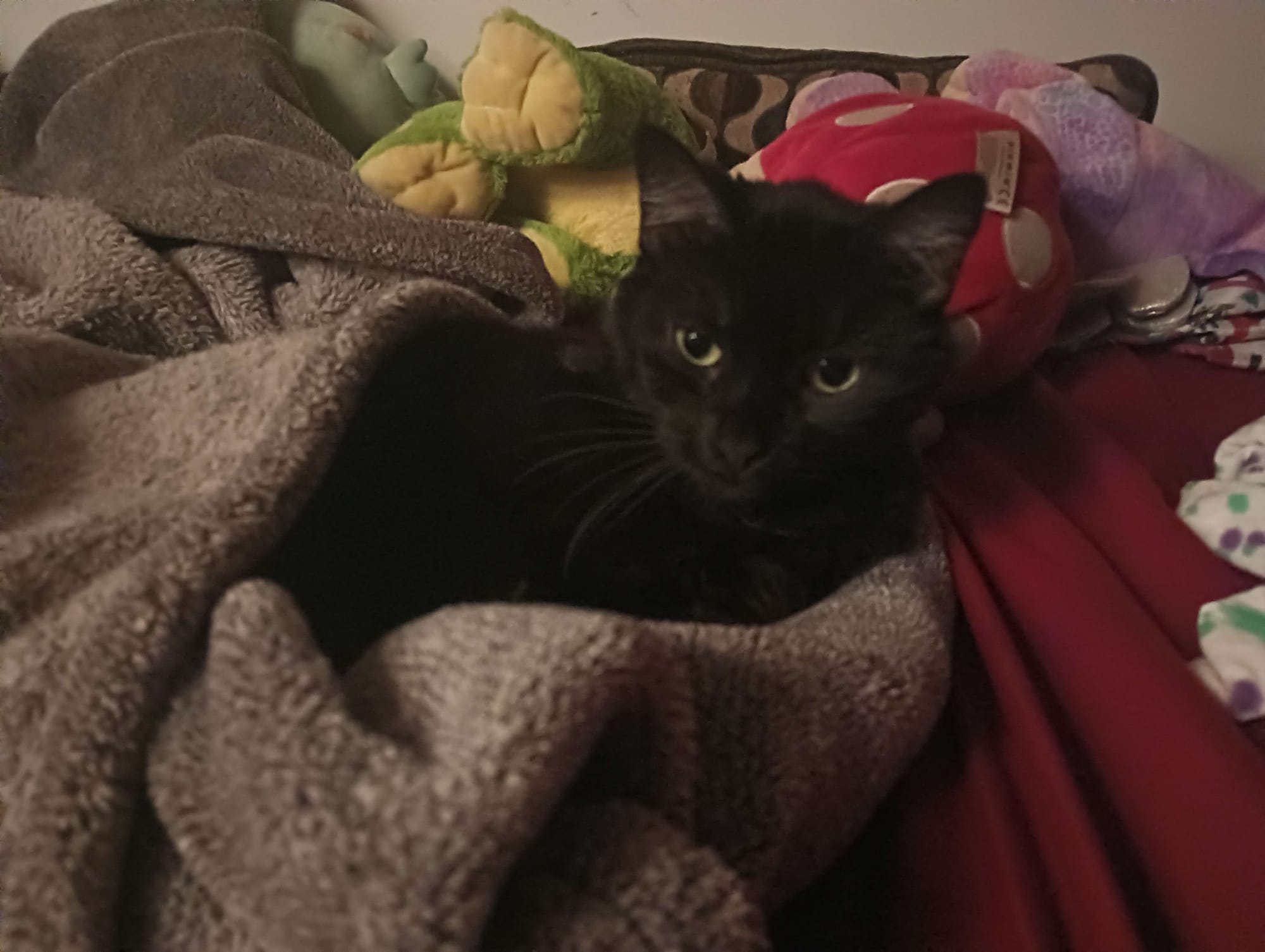 If this were just for a blog post, you would probably want text such as “a black cat wrapped in a gray blanket”. If the fact the plushies in the background are important somehow, then you can mention them. Otherwise, because the cat in the blanket is the focal point, you’d focus on just her. If this was an introduction to how wonderful Fish the cat is, then maybe you’d spend more time describing how her eyes are yellow and that she’s a short hair cat specifically. Or, if this was more about photography, you could go into detail about shot composition and color value. Whatever the case may be, keep it to what matters, and try to keep it brief. If needed, you can go into more detail about the photo either in a description directly afterwords or in the blog post.